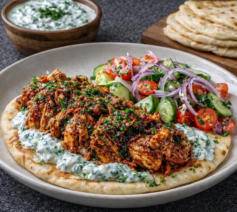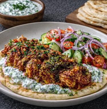 • Shawarma-spiced pulled chicken